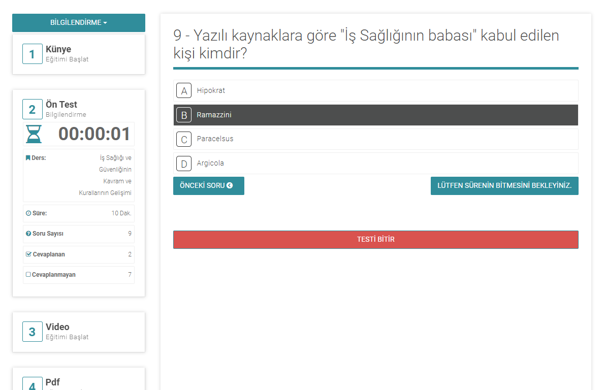 Dersi başlat butonuna tıkladıktan sonra test bölümünde soruları cevapladıktan sonra