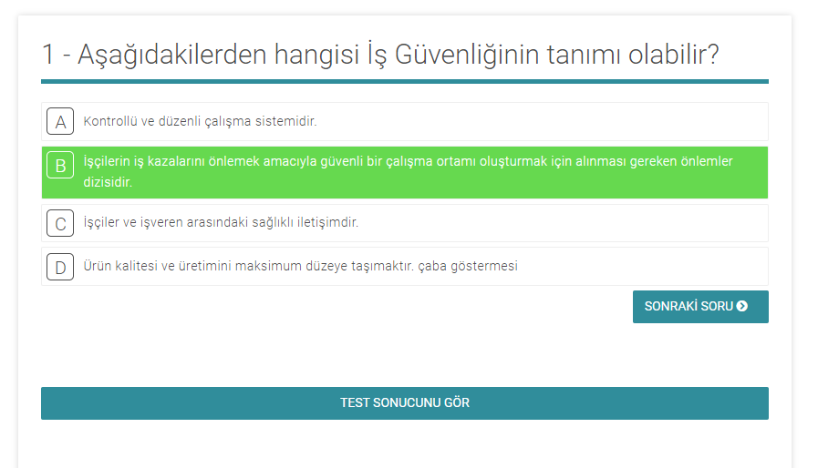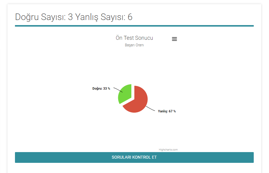 Test sonuçları "Testi Bitir" dedikten sonra gelen "Test Sonucunu Gör" butonuna basarak doğru cevap , yanlış cevap ve başarı bilgisi yer alacaktır .